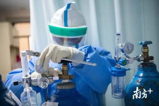2月7日,南方医科大学南方医院护师张志博正在给病人更换氧气瓶。