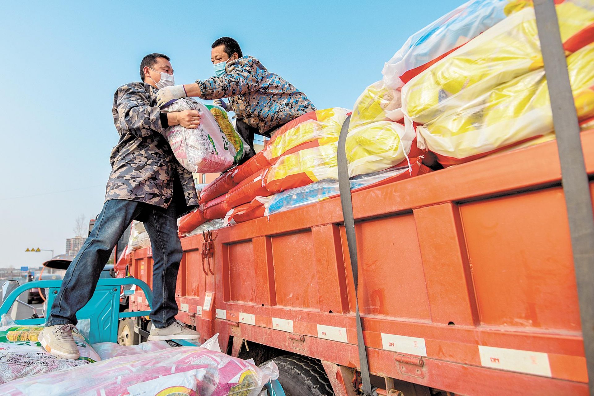 3月12日,在荆州市百盟农资大市场,工作人员在装运春耕物资。根据疫情防控需要和春耕备耕实际,荆州市采取分区分类施策,有序恢复农业生产。通过以村为单位进行摸底排查,统计全市农户的农资需求,政府积极组织农资企业供应,由村组采取“点对点、无接触”的方式,配送到农户手中。