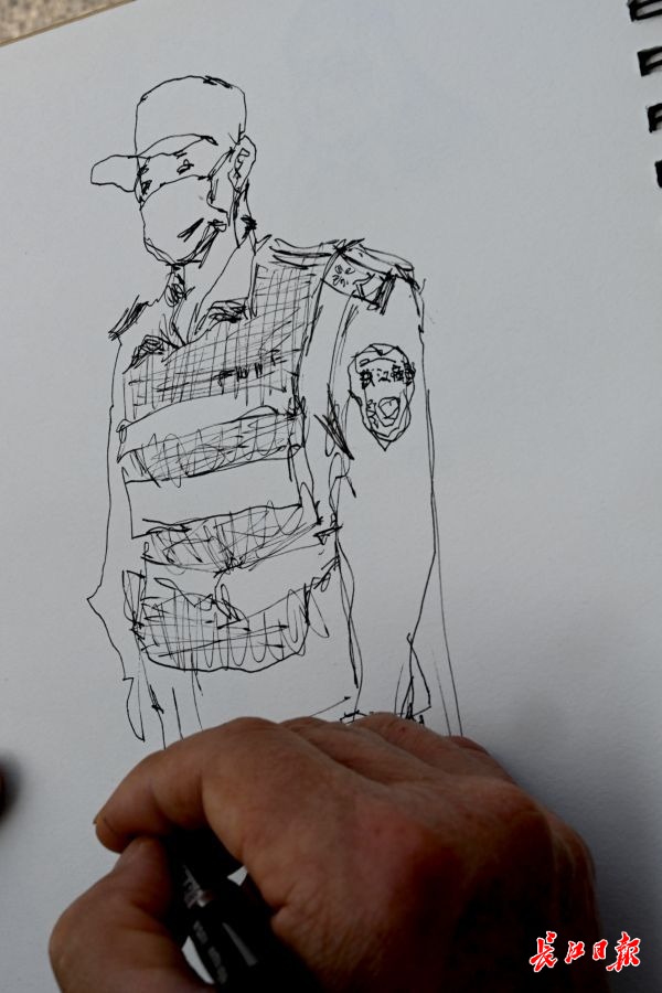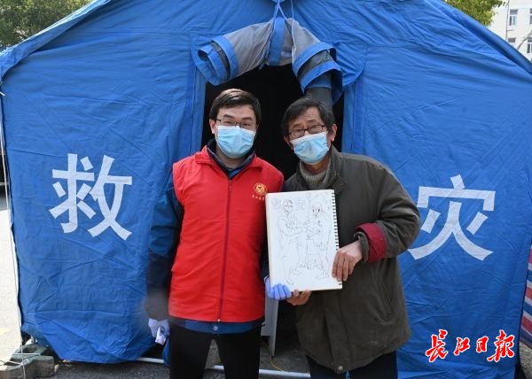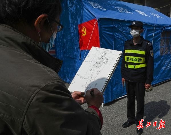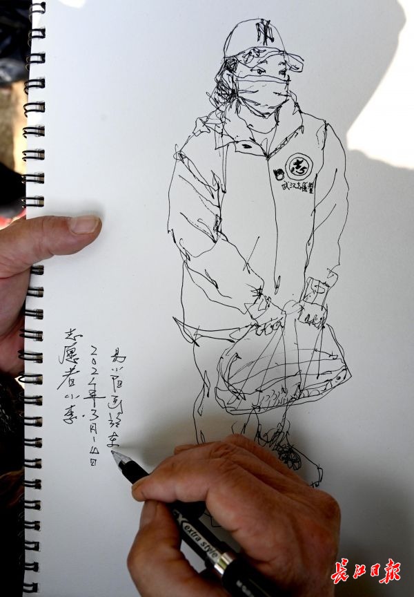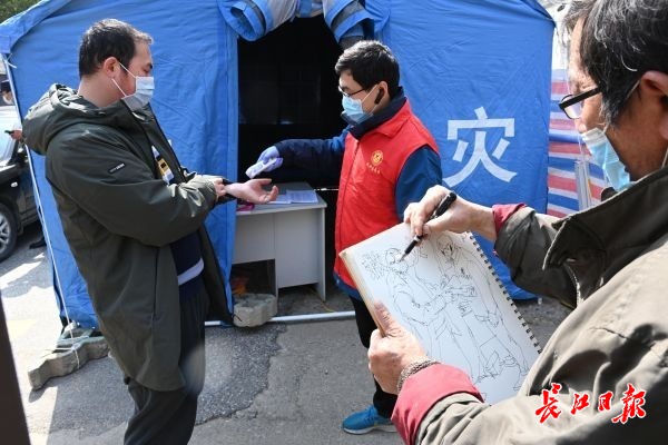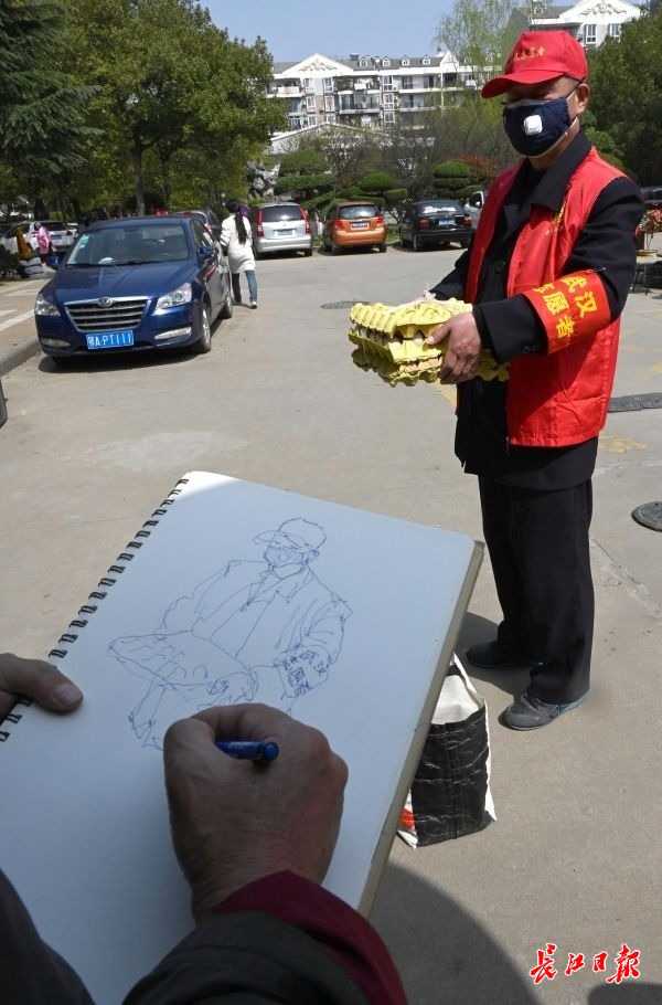 长江网3月14日讯 14日,在东西湖区常安佳苑小区,退休美术教师易小阳用手中的画笔,为社区志愿者、下沉党员干部等工作人员画画。