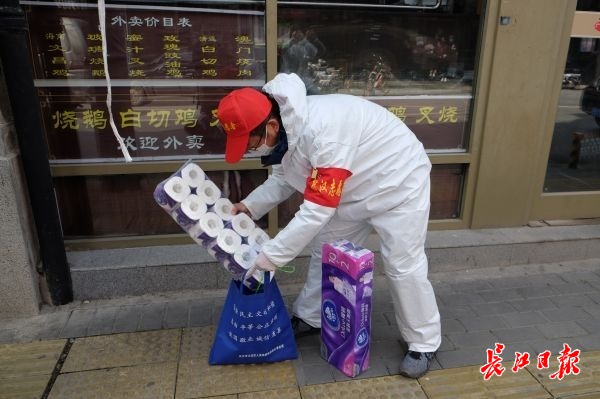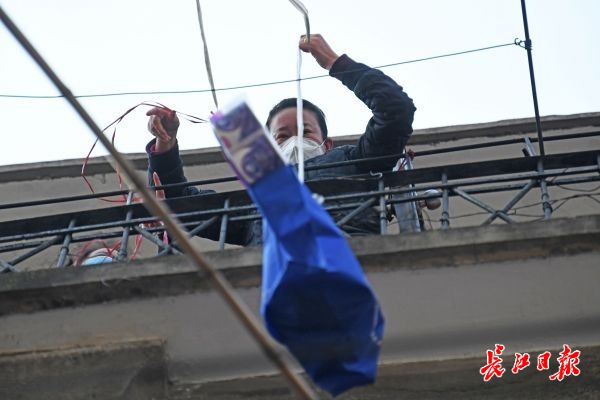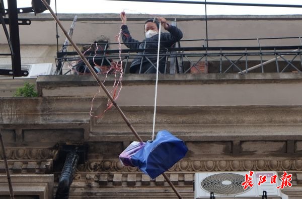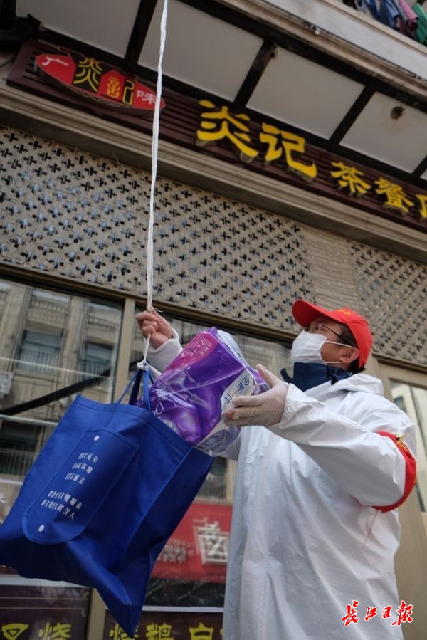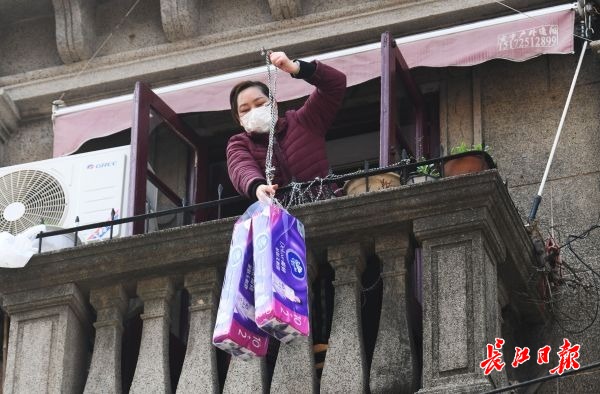 长江网3月14日讯 14日,长江网记者在汉口南京路的扬子社区看到,来自一元街的社区工作人员和下沉干部为了方便社区居民,提前购买好卫生纸等生活用品,送到居民楼下,居民们隔着街道从楼上将购买的生活用品用吊绳取回,最大限度避免了人与人的接触。 (记者詹松 摄影报道)