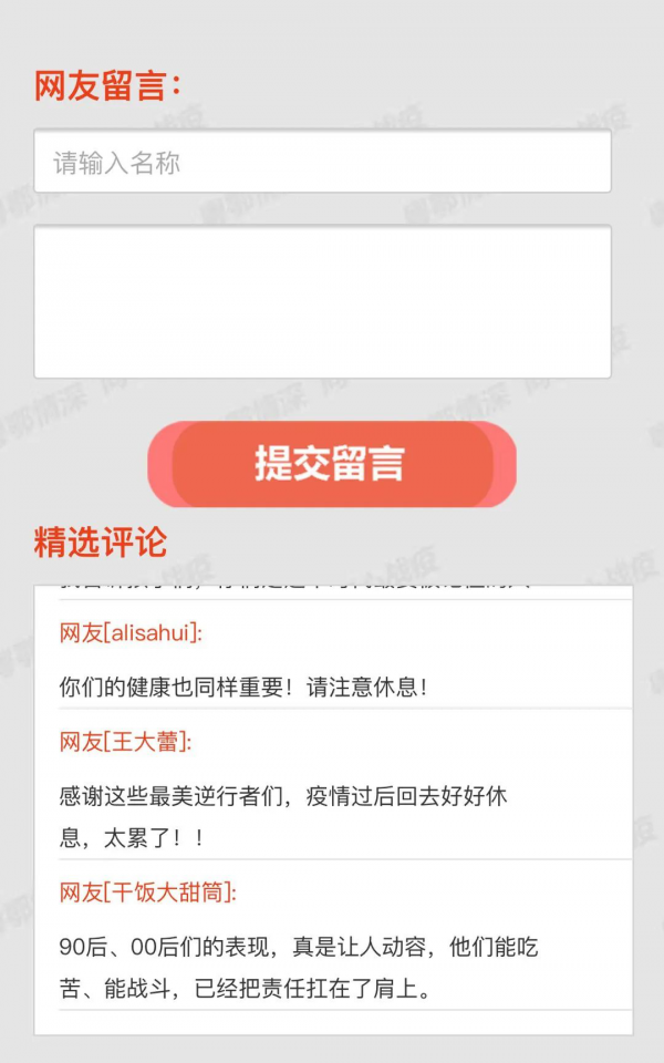 该专题开设“决战决胜”“抗疫先锋”“守望相助”“万企驰援”四个栏目,分别开设留言版块,诚邀广大网民记录所感所想,共同为战疫一线人员加油鼓劲。