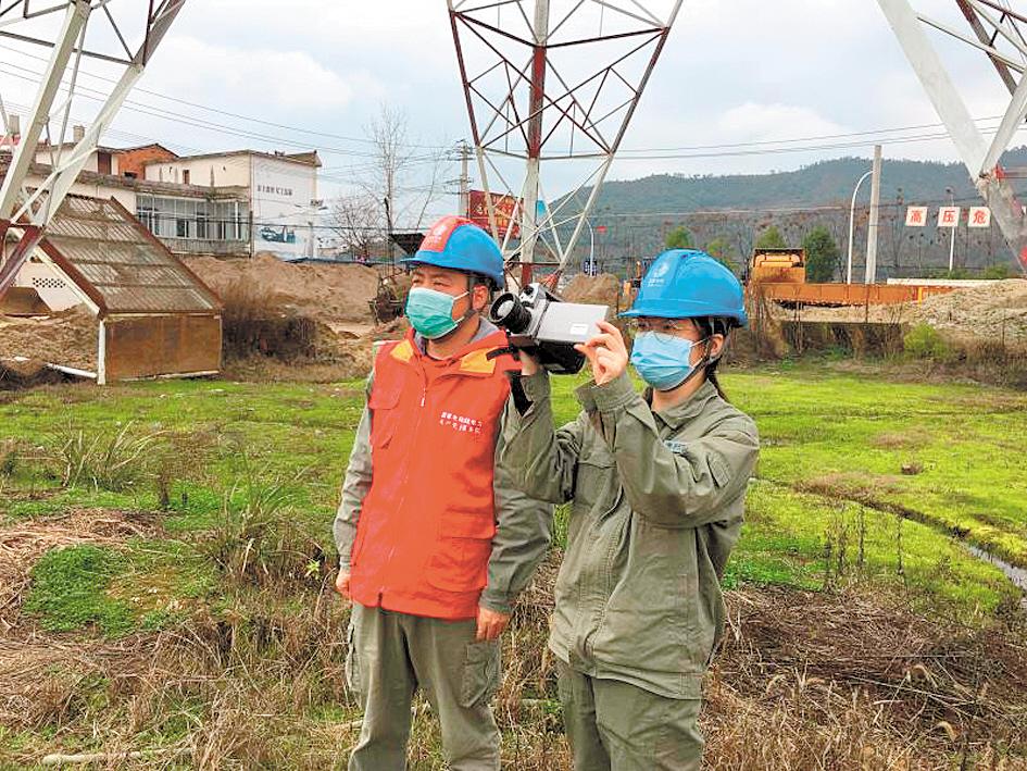 邹语晨(右)与师傅梅杨一起巡检线路。