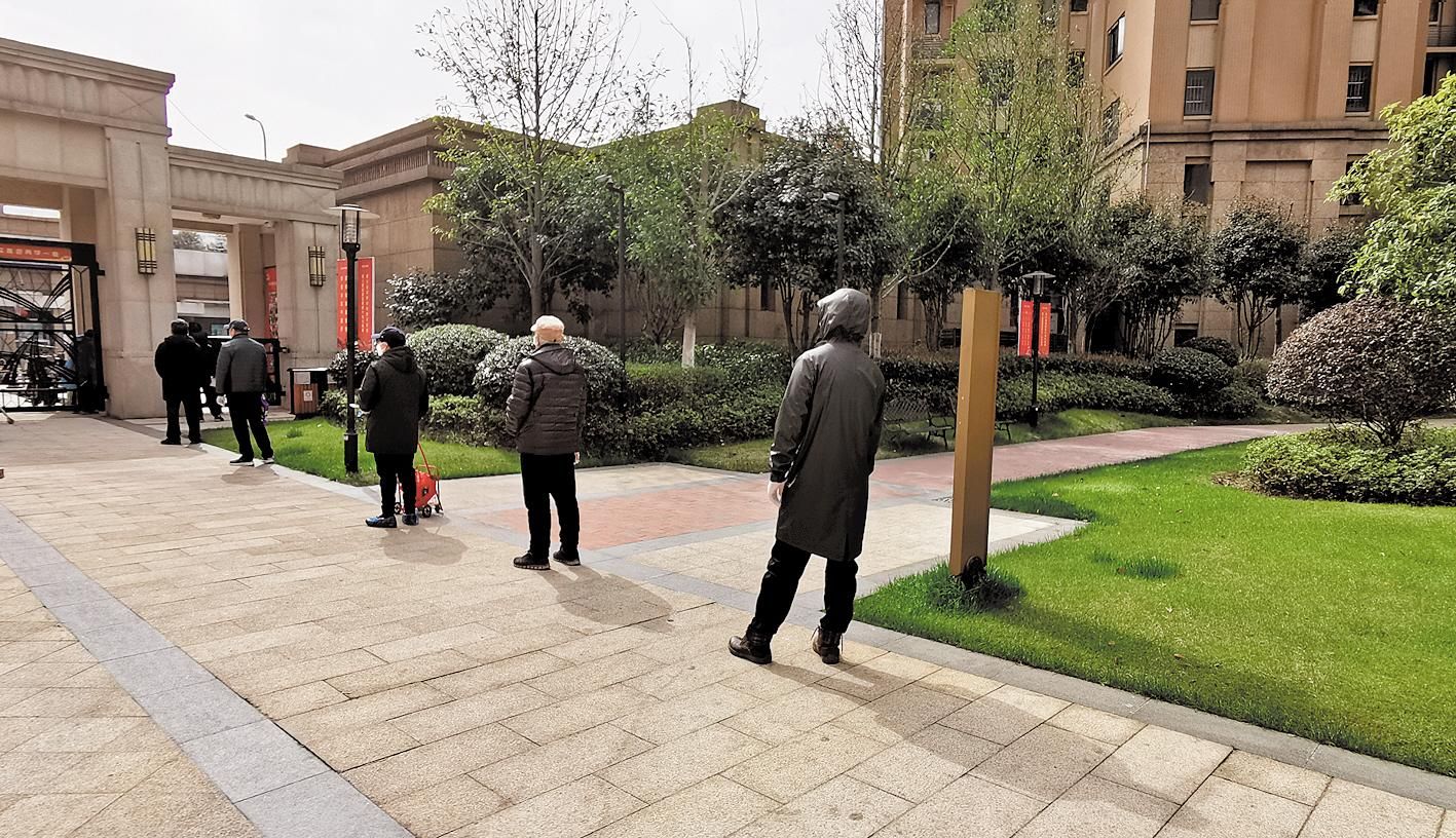 3月14日,武汉市武昌复地东湖社区居民间隔一米距离排队等候领取团购的蔬菜,确保安全。(湖北日报全媒记者 田悦 摄)