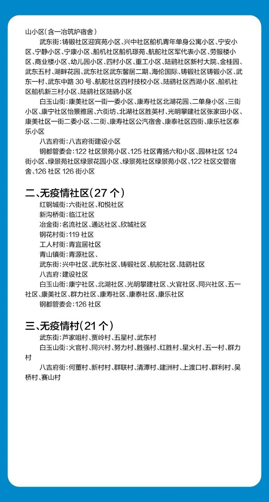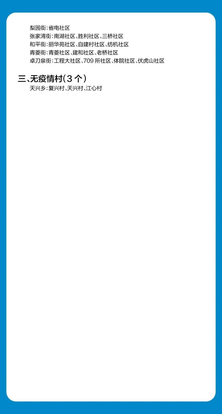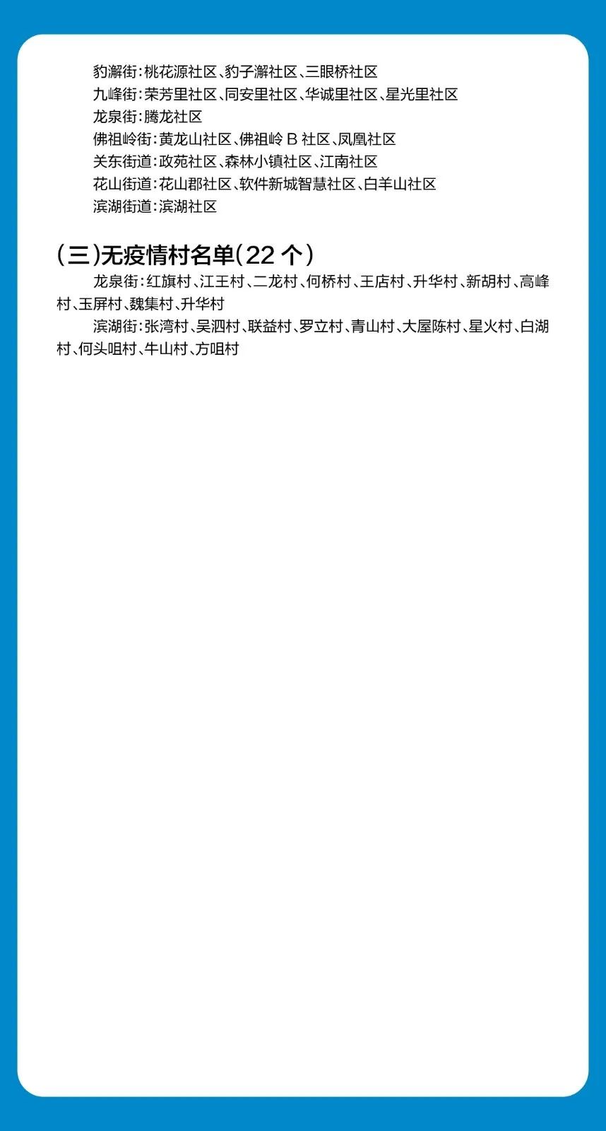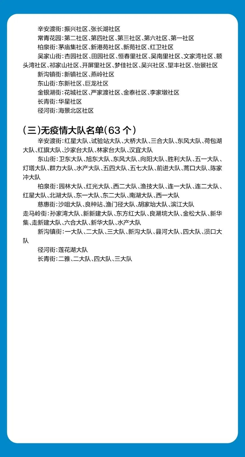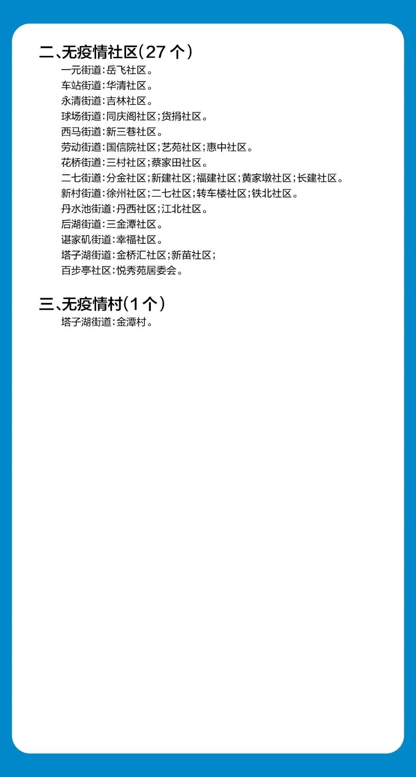 同时因疫情变化核查处理,无疫情小区取消或暂停27个,无疫情社区取消或暂停3个,无疫情村(大队)取消或暂停9个。