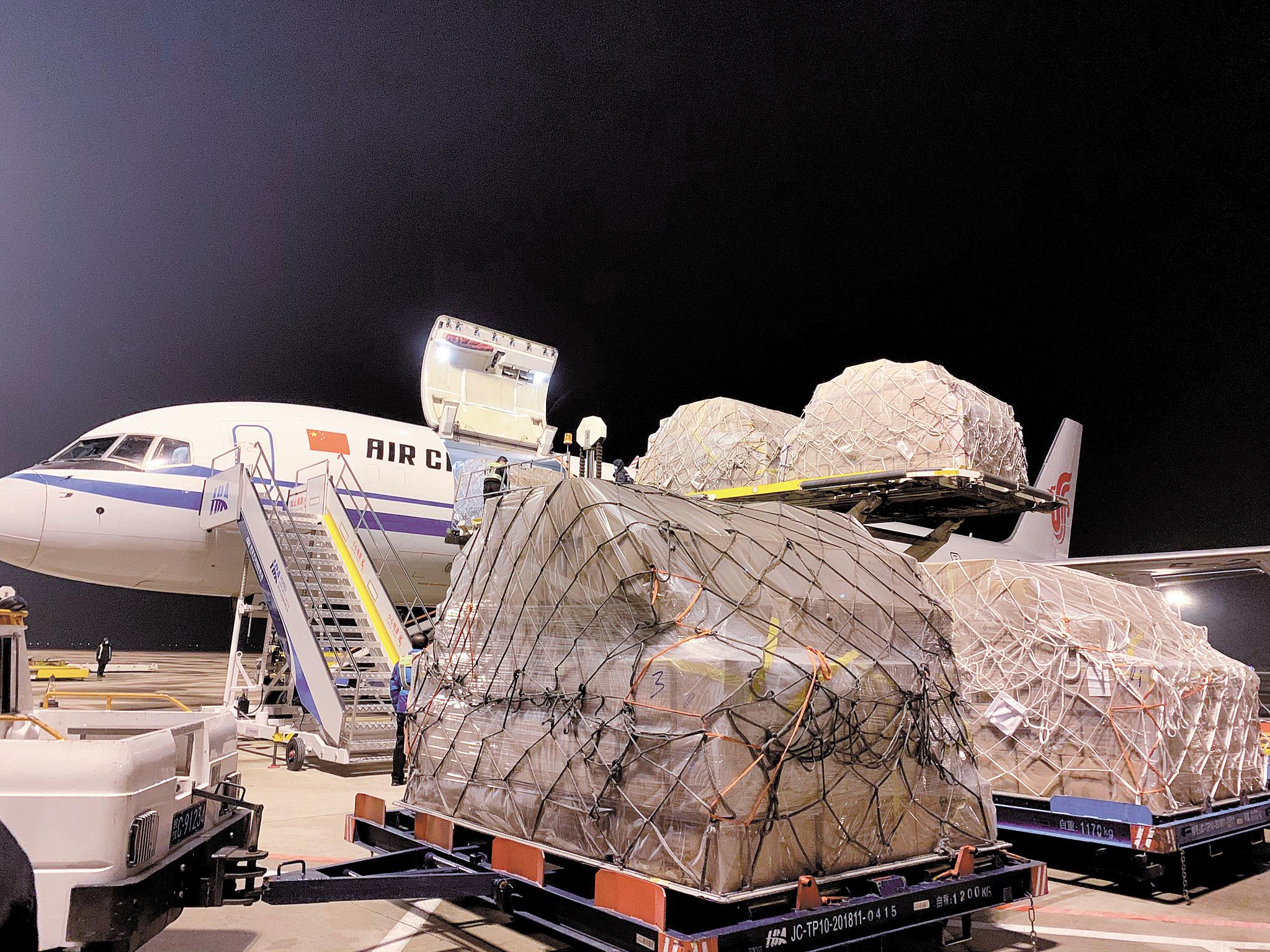 1月26日,由中国国际航空执飞的卓尔应急医疗物资专机抵达武汉,从金边运来了20万套防护服。 (湖北日报全媒记者 柯皓 摄)