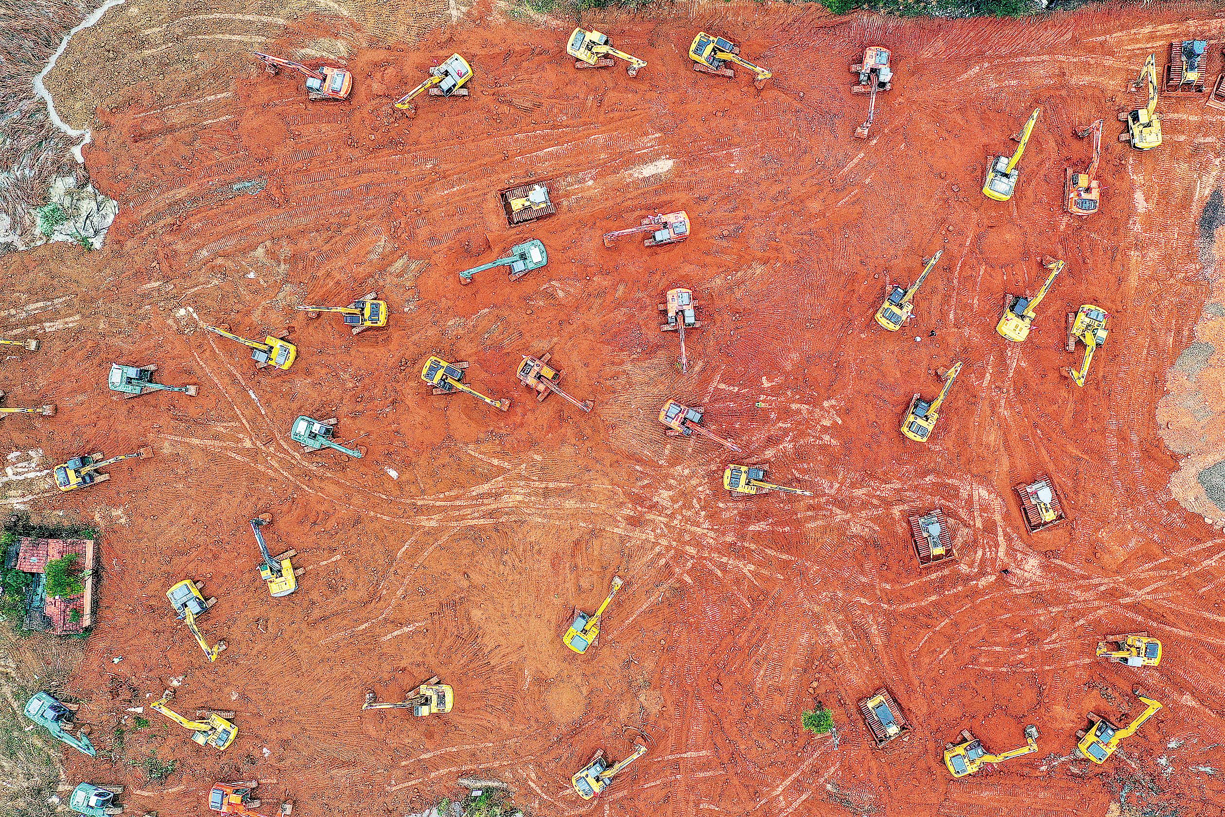 1月24日,火神山医院项目施工现场,各种大型施工机械正在紧张忙碌地挖掘土方、平整地面。(湖北日报全媒记者 梅涛 摄)