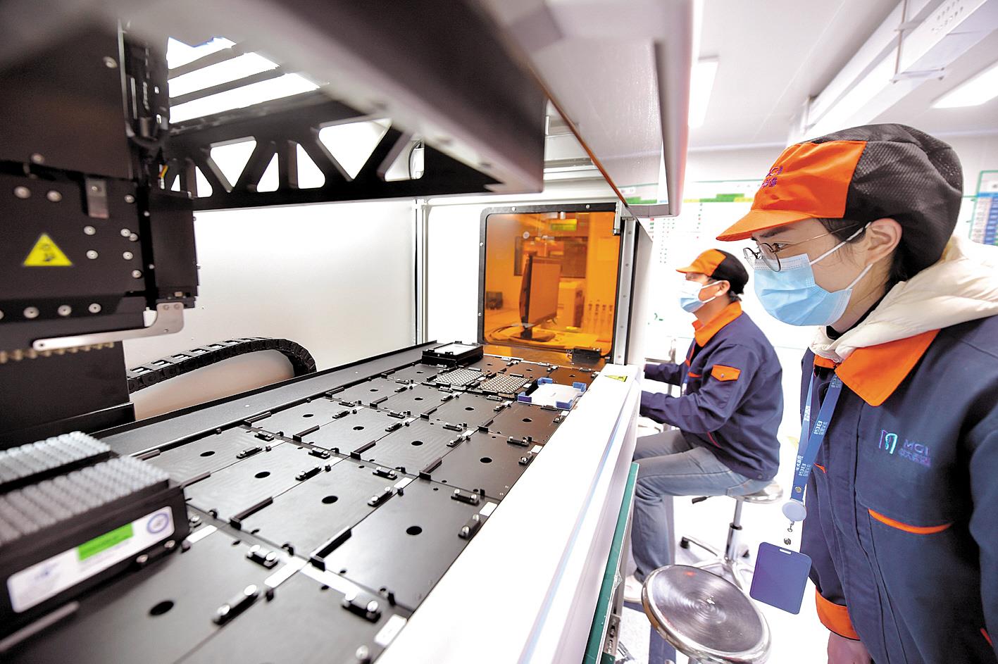 2月12日,武汉华大智造科技有限公司仪器生产车间,科研人员正在对即将出厂的高通量自动化样本制备系统MGISP-960进行检验。该设备是核酸检测排查的自动化设备,单台可同时提取96份样本。(湖北日报全媒记者 李溪 摄)