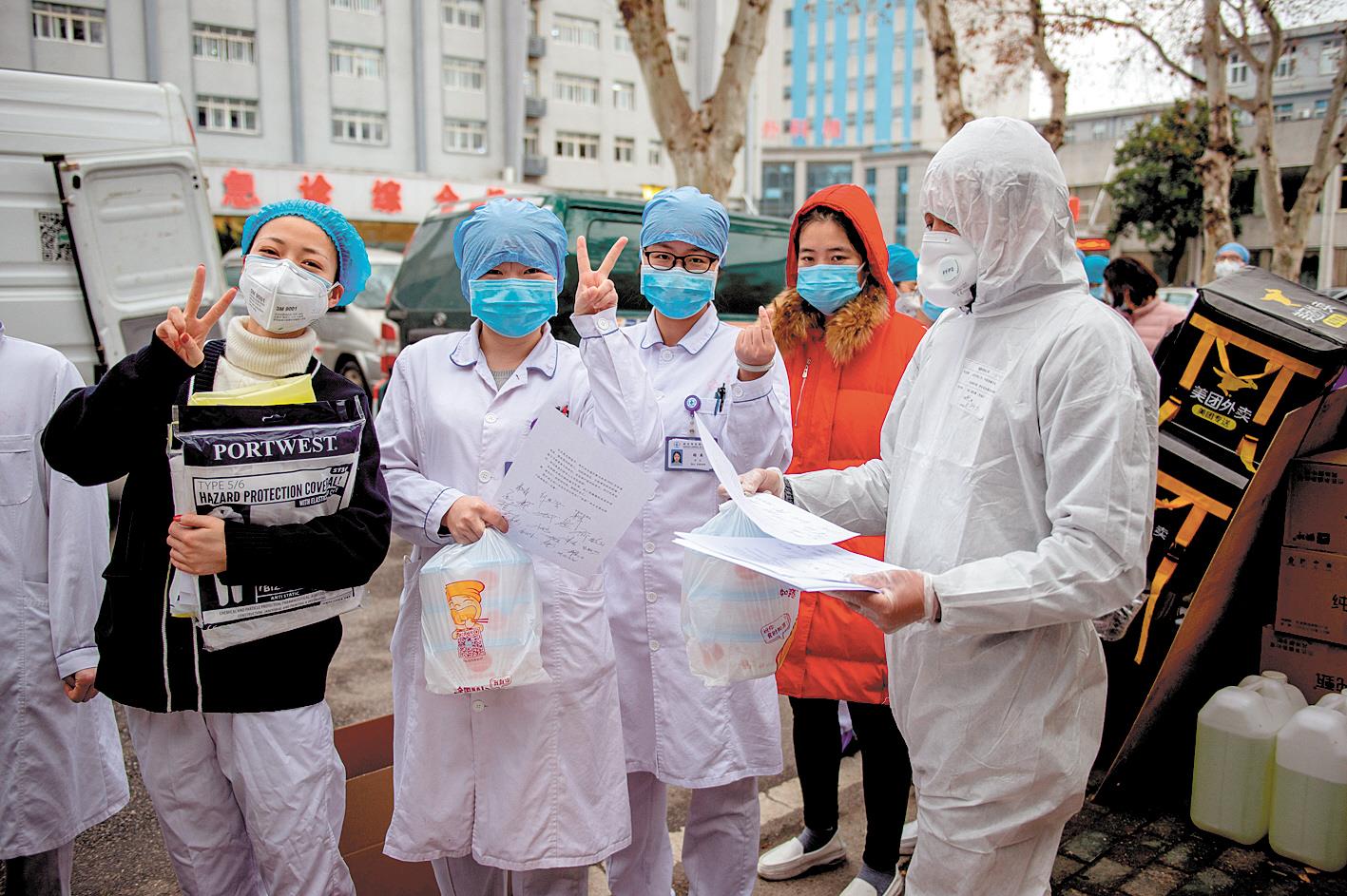 2月8日,元宵节,汉阳医院超市门口,美团外卖联合爱心商家为奋战在抗疫一线的医护人员送上热腾腾的汤圆和饭菜。(湖北日报全媒记者 蔡俊 摄)