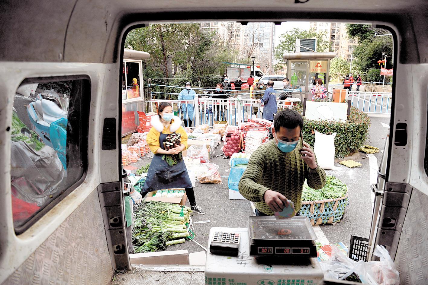 2月17日,武汉市东湖景园联合超市给居民提供新鲜蔬菜。 (湖北日报全媒记者 周立新 蔡俊 摄)