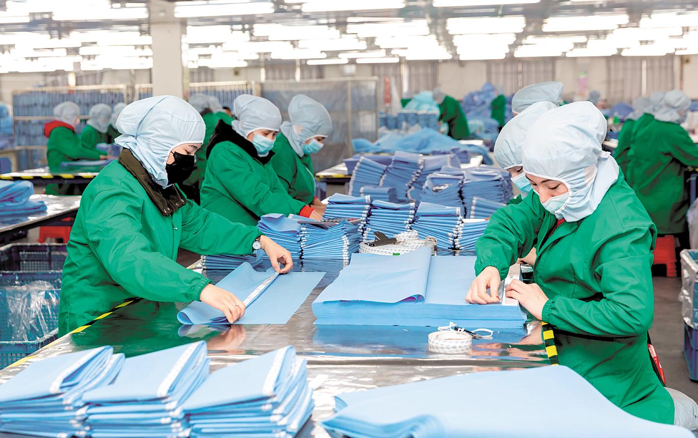 1月27日,仙桃市三伏潭镇宏昌生物医疗科技生产车间,工人正在抓紧生产手术衣、防护服、隔离衣等医疗产品。 (湖北日报全媒记者 徐敏 通讯员 吴晴霄 摄)