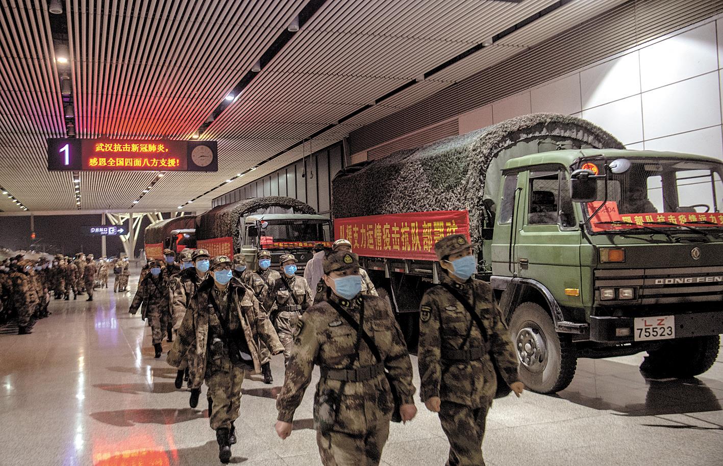 2月13日晚,武汉高铁站,驻鄂部队抗击疫情运力支援队官兵在运送解放军医疗队物资。(湖北日报全媒记者 魏铼 摄)