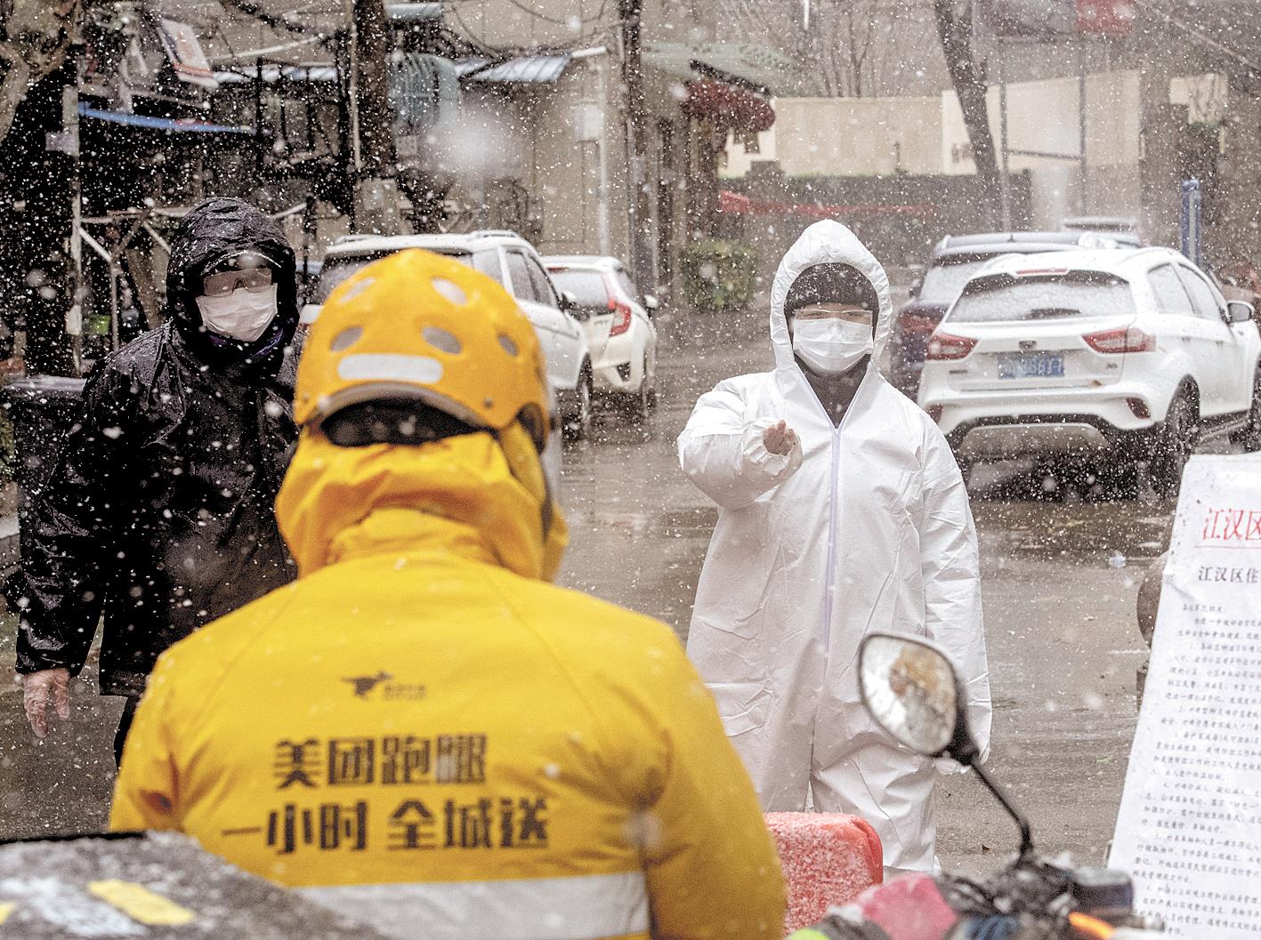 2月15日,江汉区循礼社区,来自省供销社、武汉市城管委、江汉区老干局的下沉党员干部在小区入口冒雪值守。2月5日,我省要求党员干部下沉村(社区),与村(社区)现有力量联合组成疫情防控工作队。截至目前,省直机关已有100多家单位与联系点社区进行对接,投入疫情防控阻击战。 (湖北日报全媒记者 魏铼 摄)