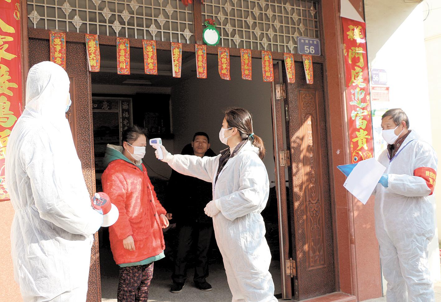 2月5日,鄂州市临空经济区新庙镇池湖村工作人员在为武汉返乡的人员测量体温。为防控新冠肺炎疫情,全省各地织牢乡村防控网,对村和小组实行封闭防控,并做好返乡人员的摸排登记及身体检测等工作。 (视界网 方钢 摄)