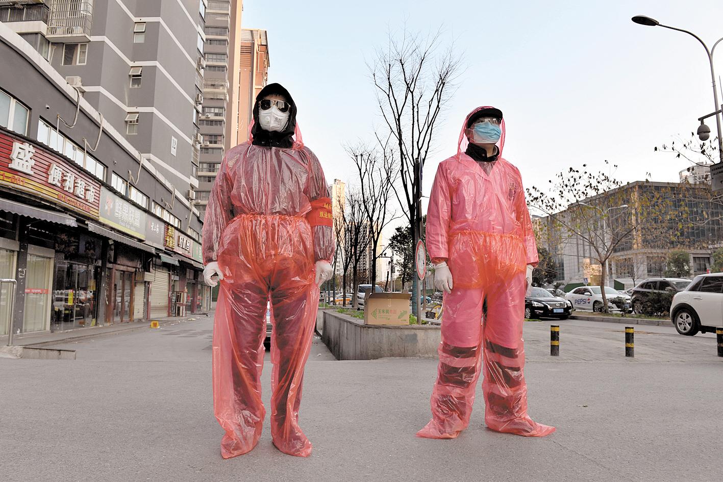 2月19日,武汉市东沙花园小区门前,武汉地铁集团员工参与小区封闭值守。因防护衣紧缺,他们把价值约5元的雨衣当作防护服穿。 (湖北日报全媒记者 周立新 蔡俊 摄)