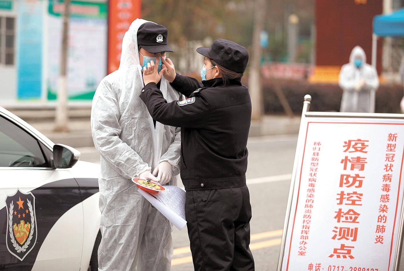 2月7日,在秭归县高速公路出入口处的疫情检测点,女警谭婳(右)为前来接替执勤的丈夫许聪戴好防护口罩。秭归县阻击新冠肺炎疫情的战场,8对警察夫妻坚守一线。 (视界网 吴令剑 摄)