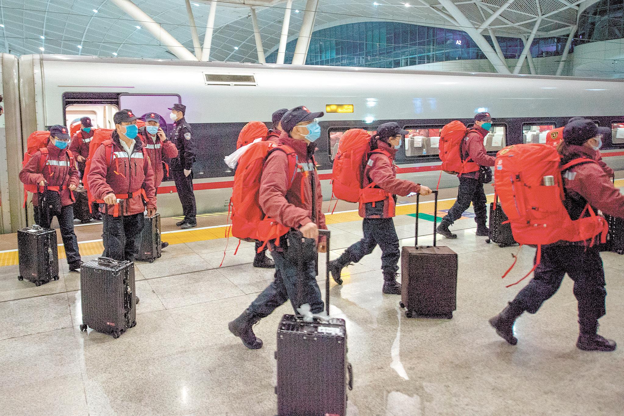 2月4日晚,国家紧急医学救援队(广东)援鄂医疗队57名队员抵达武汉,开展新冠肺炎救治工作。迄今,全国有380多支医疗队、4.26万名医护人员驰援湖北。 (湖北日报全媒记者 蔡俊 摄)