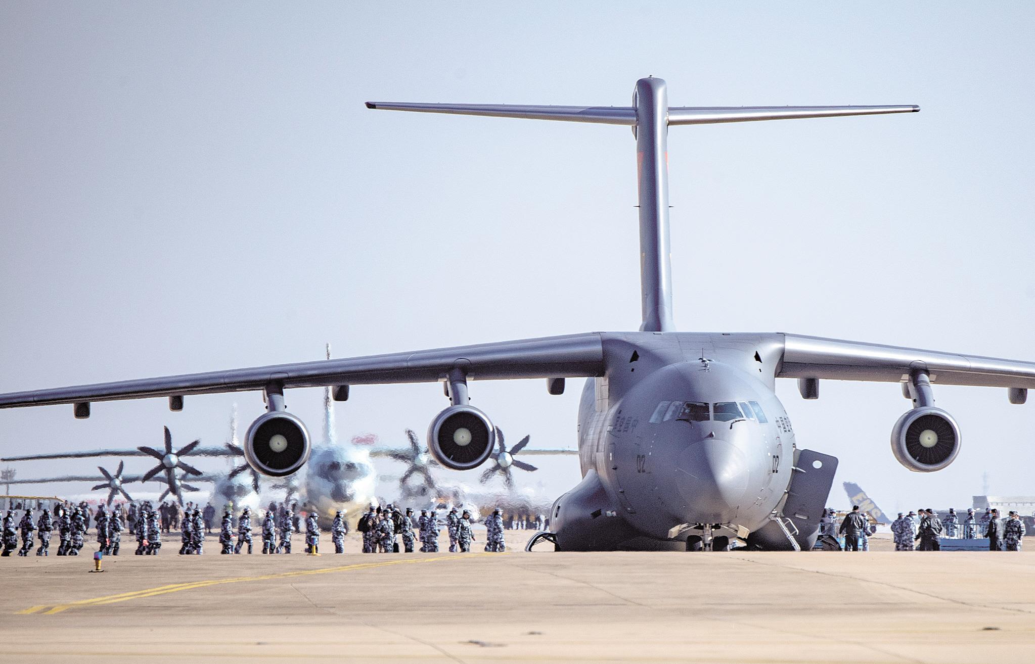 2月17日,人民解放军空军再次出动运-20等三型多架运输机,从上海虹桥等7个机场起飞,向武汉紧急空运军队支援湖北医疗队676名队员和50吨医疗物资。 (湖北日报全媒记者 魏铼 摄)