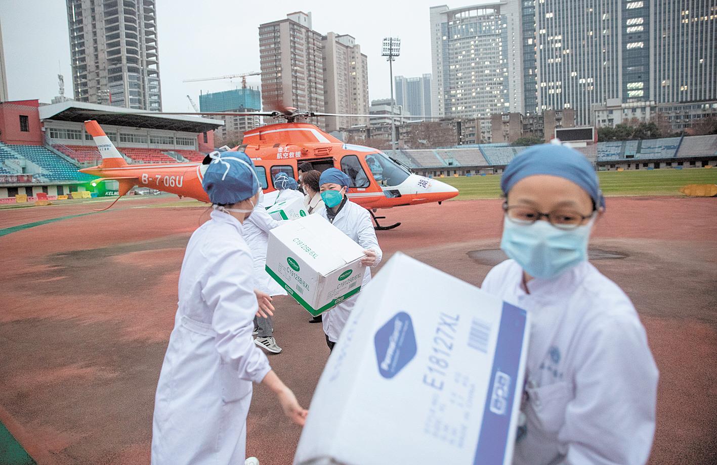 2月1日,武汉市新华路体育场,协和医院的医护人员从直升机上搬运从仙桃空运来的医疗物资。 (湖北日报全媒记者 柯皓 摄)
