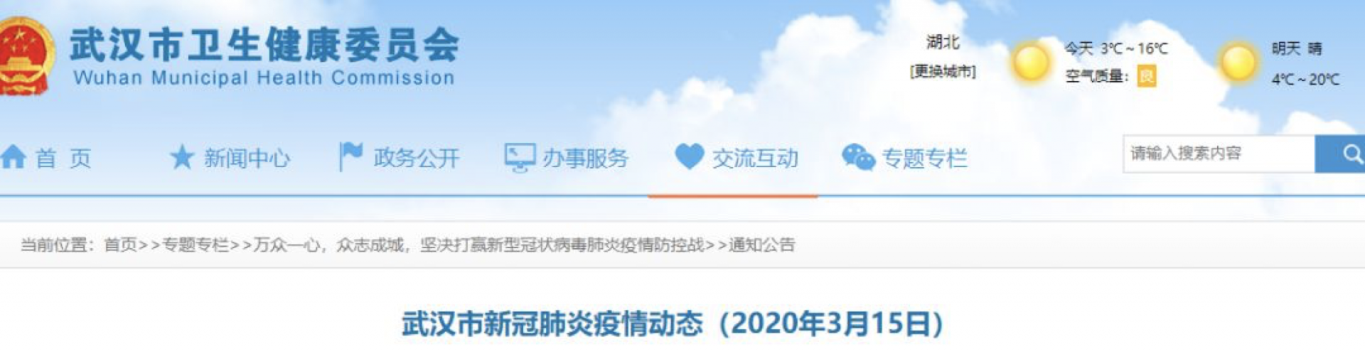 武汉市3月15日疫情动态刚刚发布。据武汉市卫健委通报,2020年3月15日0-24时,全市新增确诊病例4例,其中1例来自住院,1例来自隔离点,2例来自门诊。