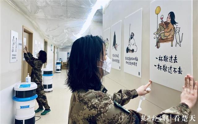 楚天都市报3月16日讯(记者陈凌燕 通讯员曾理)3月16日,军队支援湖北医疗队为隔离区的每间病房,都贴上一幅幅色彩鲜明、轻松活泼的治愈系漫画。“希望这些画能给病区增加一道光亮,给患者们的心里涂上一抹亮色。”护士李智说。