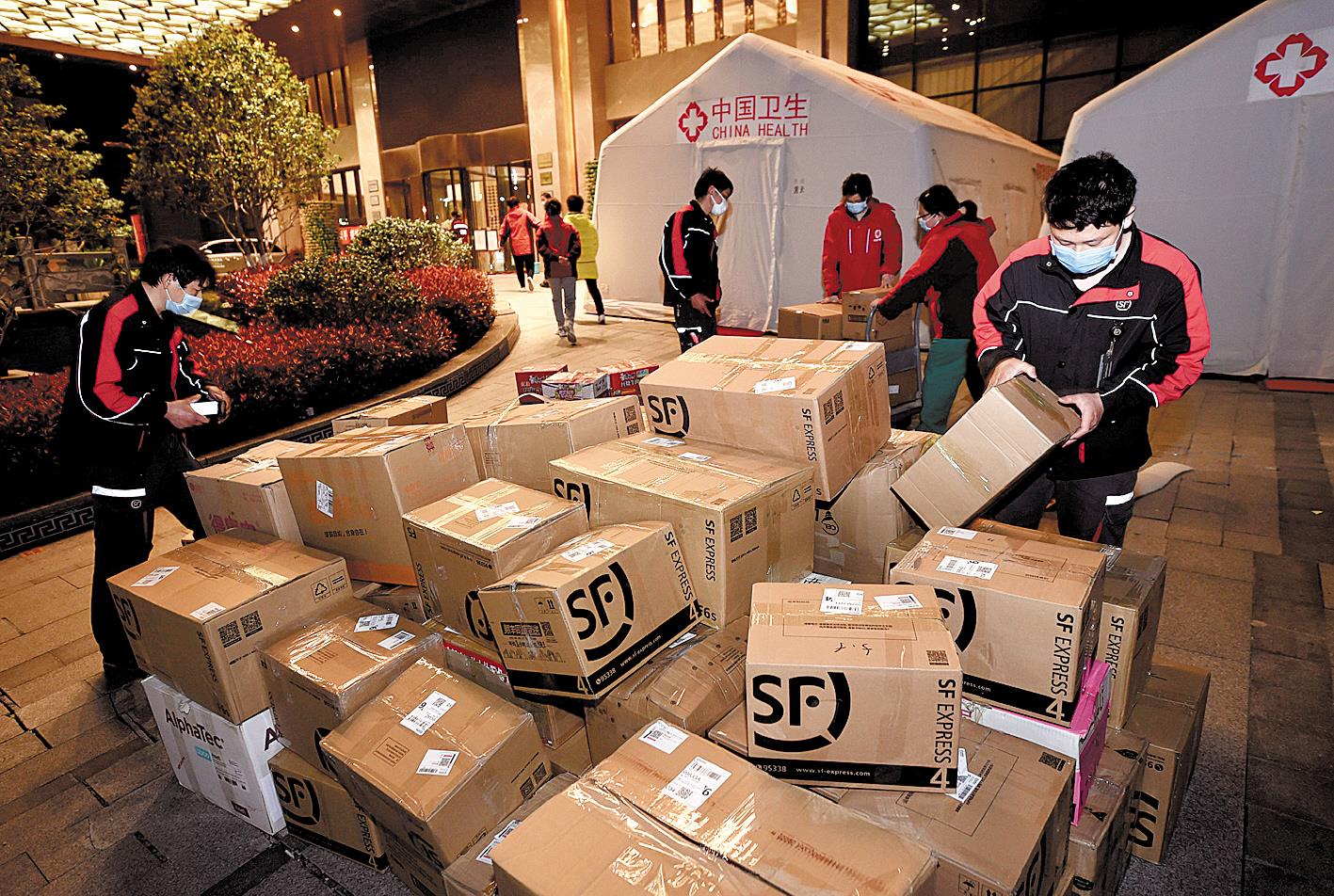 3月16日晚9时,武汉东西湖华美达酒店门口,顺丰速运的三名快递小哥仍在收寄来自新疆、重庆、江苏等医疗队的物品。湖北顺丰自3月14日起,为所有援鄂医疗团队提供返程行李免费寄递服务,以实际行动致敬逆行奋战在抗疫一线的白衣天使们。