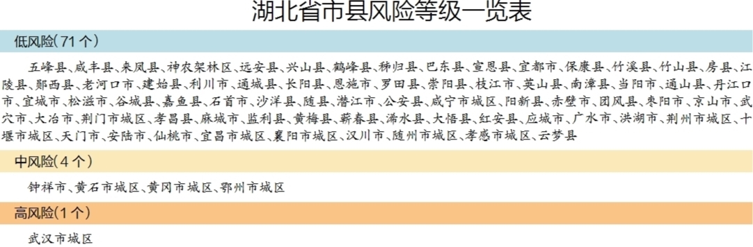 湖北日报讯 (记者龙华、通讯员曹勤)3月16日,全省市县疫情风险等级更新。依据国务院应对新型冠状病毒感染肺炎疫情联防联控机制《关于科学防治精准施策分区分级做好新冠肺炎疫情防控工作的指导意见》中的风险划定标准,经省疾控中心组织专家评估,截至3月15日24时,全省低风险市县71个,中风险市县4个,高风险市县1个。