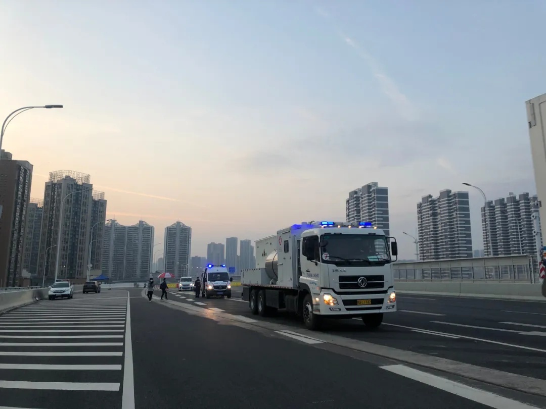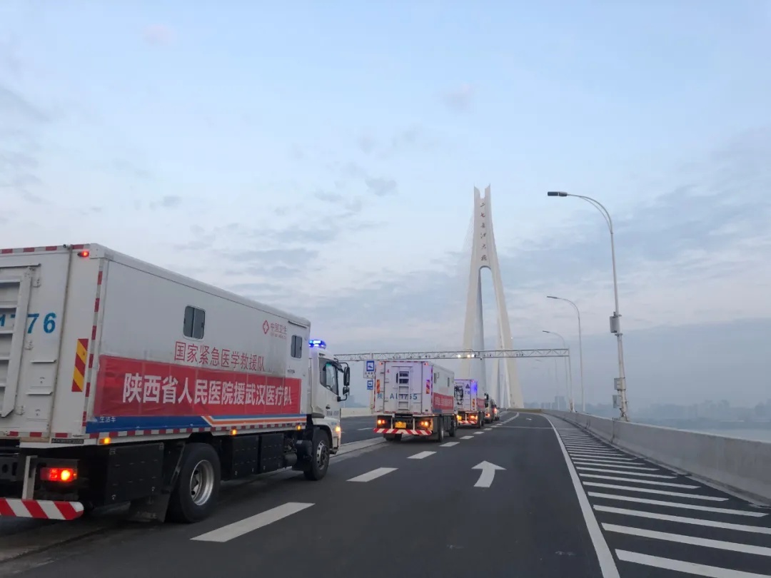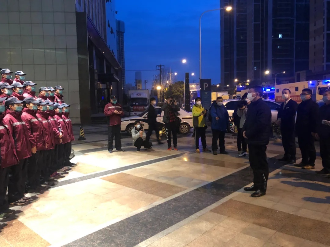 清晨6点整,国家紧急医学救援队(陕西)在武汉青山区武钢体育中心对面天际丽豪酒店门口出发返回,车辆9辆,队员43人。