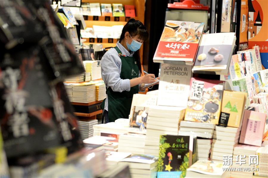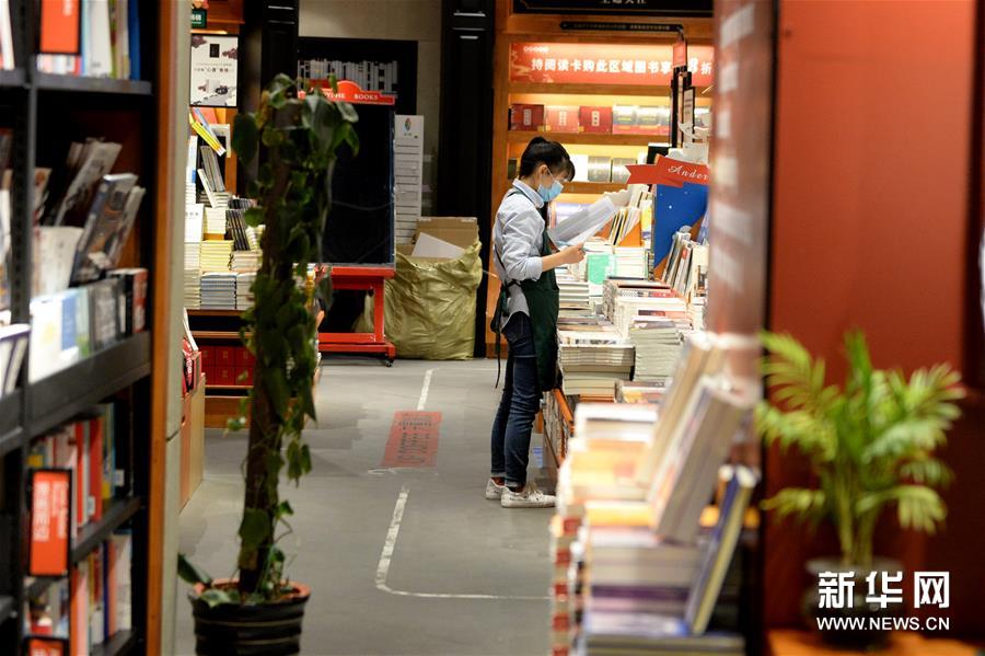 3月16日,在西西弗书店(合肥万象城店),工作人员在整理书籍。当日,合肥市实体书店、城市阅读空间、公共文化场馆在落实好疫情防控措施的基础上恢复开放开业,市民们走进书店,选购书籍,充实文化生活。新华社发(黄博涵摄)