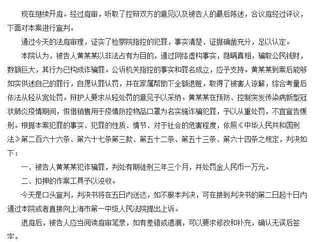 澎湃新闻记者从庭审中获悉,被告人黄智博因犯诈骗罪,被法院判处有期徒刑三年三个月,并处罚金人民币一万元。