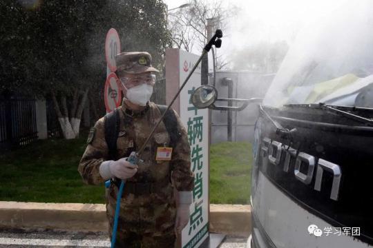 对进入院区车辆进行洗消。解放军报记者 范显海摄
