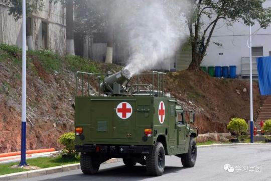 使用防疫卫生车对院区进行消毒。解放军报记者 范显海摄