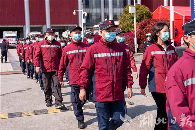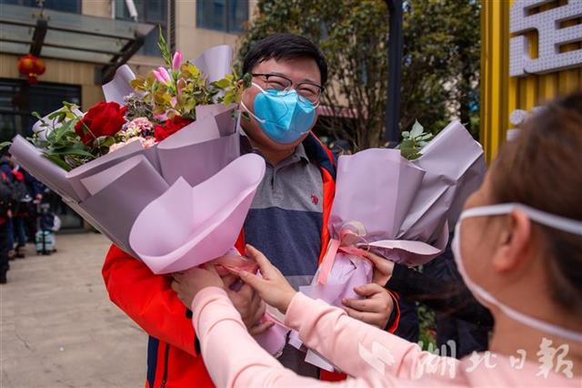 3月17日,武汉市江夏区纽宾凯楚悦酒店,武汉市民为即将返程的医护人员送上鲜花。当日,41支国家医疗队3675人(中医421人)从武汉返程,其中包括上海、安徽、甘肃、广东、贵州、海南、河南、湖南、江苏、宁夏、青海、山东、陕西、四川、天津、新疆等地的部分医疗队。