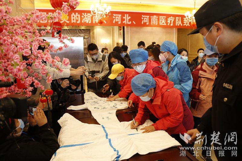 荆楚网客户端-荆楚网消息(记者陈泉 通讯员胡思洁、刘梦)3月17日下午,湖南省第六批援汉医疗队完成使命从武汉黄陂启程回湘。返程之际,黄陂区送上暖心承诺:黄陂所有景区将对湖南第六批援汉102名医护人员终生免费,队员们入住的维也纳酒店前川店也对这102名医疗队员住店终生免费。