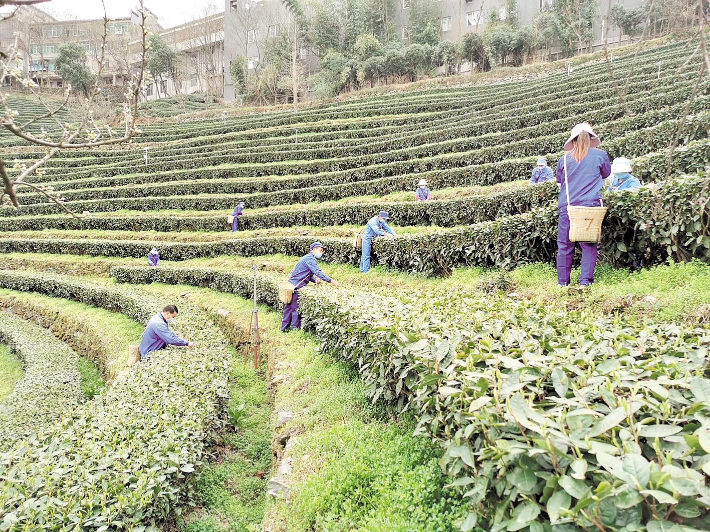 伴着悠扬的音乐,戴着口罩,背着竹篓的采茶工双手在茶树冠上起起落落,一片片嫩黄的茶芽被叼入竹篓。