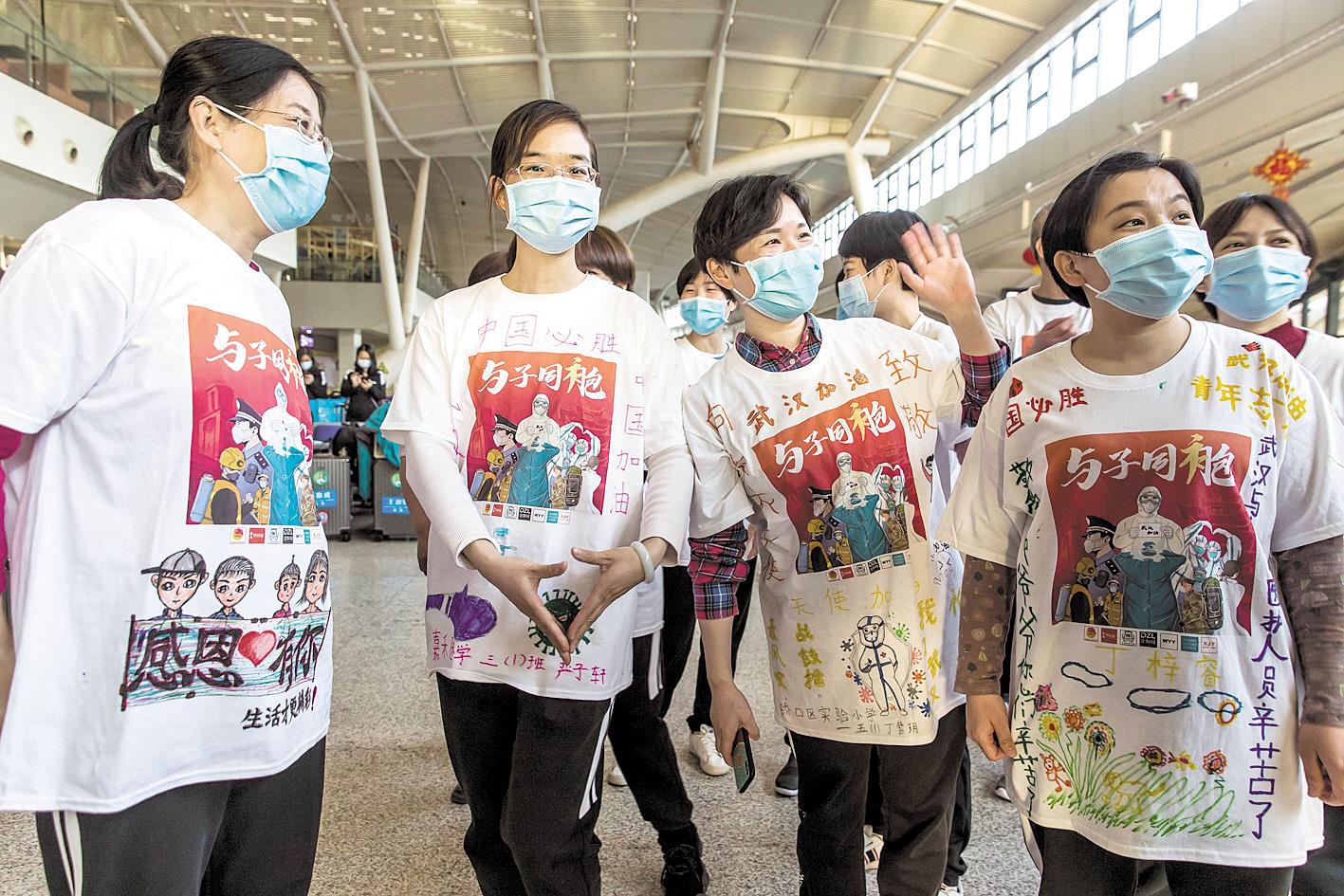 3月17日下午,湖南援鄂医疗队来到武汉火车站,准备返程。湖南中医药大学第一附属医院医护人员穿上武汉小学生赠送的绘画T恤衫,合影留念。(湖北日报全媒记者 梅涛 摄)