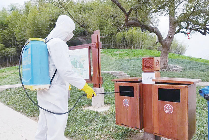 世界文化遗产良渚古城遗址公园恢复迎客,工作人员在园内进行全面消毒。