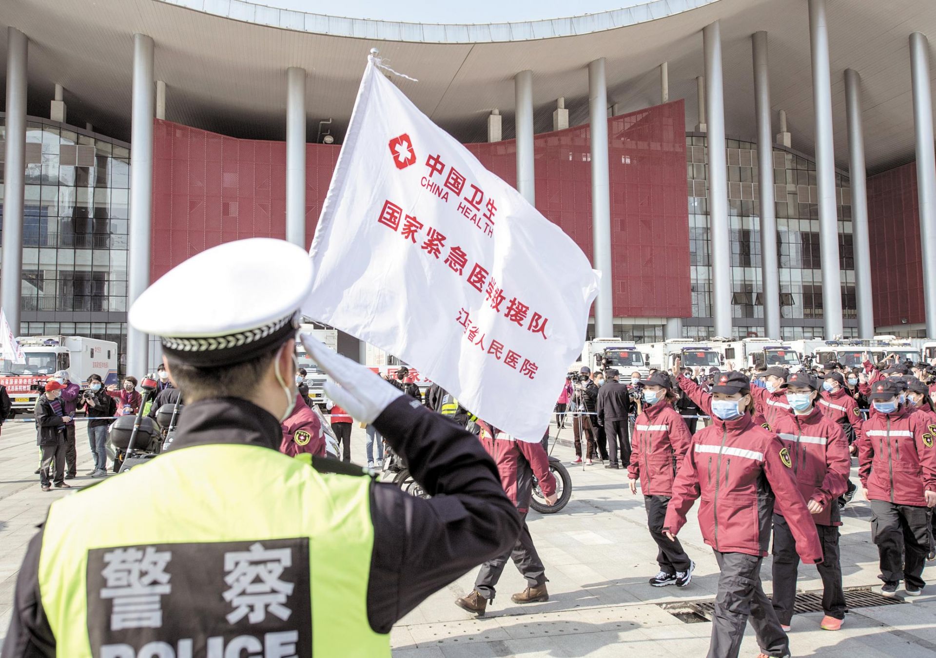 3月17日,武汉客厅方舱医院,一名武汉交警向即将踏上归途的江西援鄂医疗队敬礼。 (湖北日报全媒记者 魏铼 通讯员 董宏祥 摄)