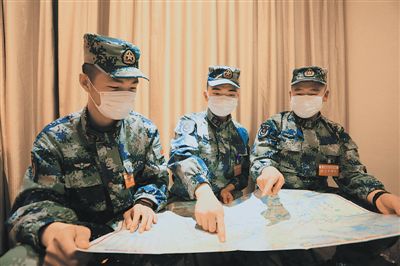 图为马鑫龙、徐锐、刘文康(从左至右)三人对照地图规划第二天的行车路线。