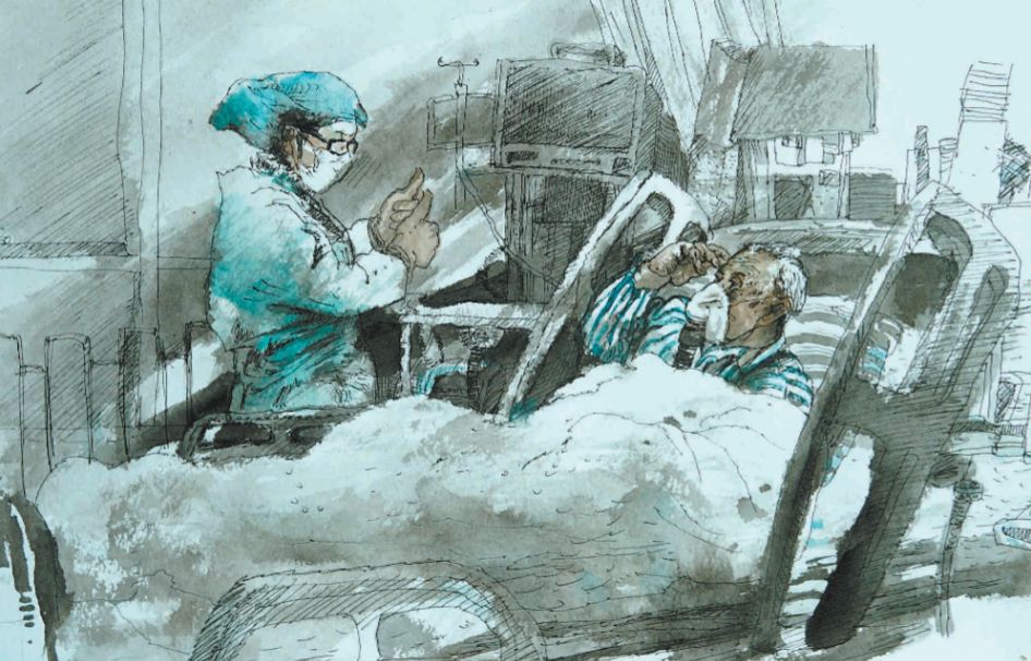 王爷爷努力地向身体上方移动着胳膊,直到一个他再也举不上去的位置。在太阳穴那里,王爷爷弯曲的手掌停住了,他是要为在场的医护人员敬一个军礼。