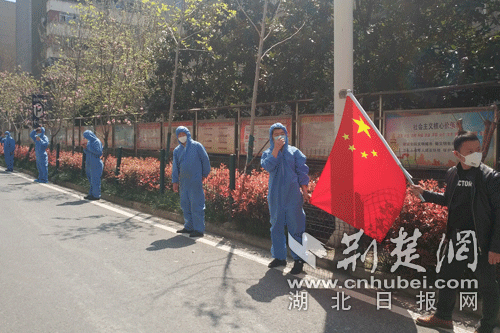 “武汉加油,中国必胜!”现场,即将踏上归程的医护人员齐声呐喊。附近小区楼上的居民打开窗户,对着车队的方向挥手喊话:“白衣战士辛苦了,武汉人民谢谢您们,一路平安!”医疗队员停下脚步,比心回应。浓浓的情谊,令人动容。