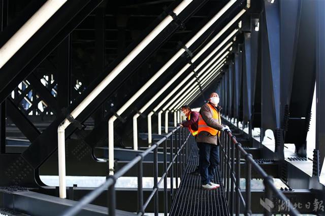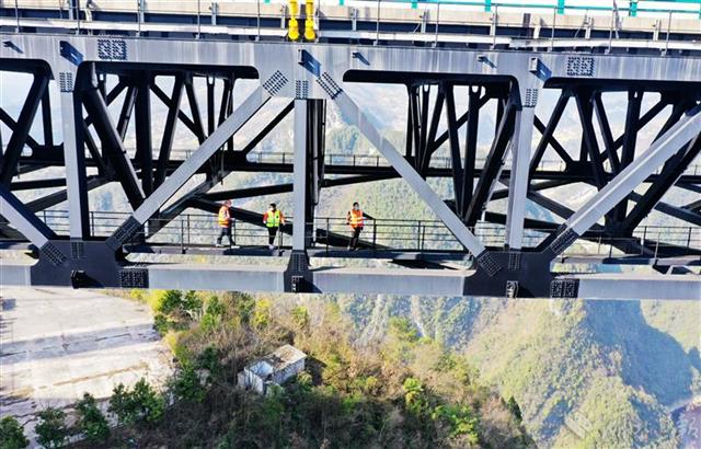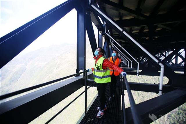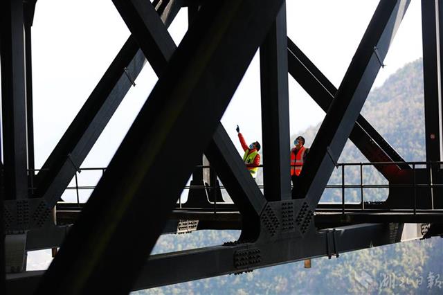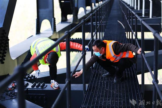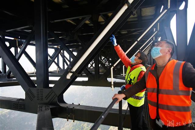 3月18日,湖北鄂西高速养护部门人员趁着晴好天气对四渡河桥梁结构进行检查,确保大桥安全。