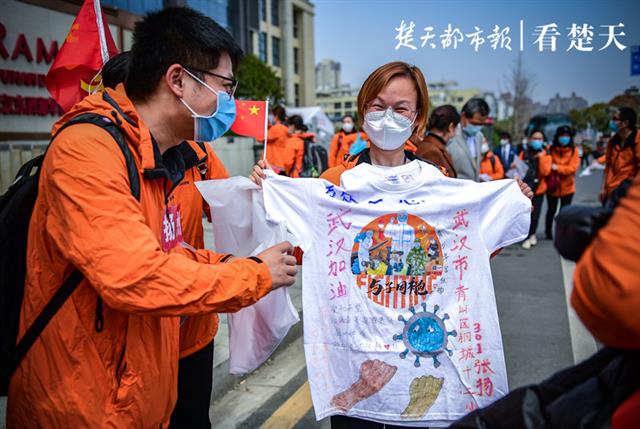 每一位回家的扬州队员,还领到了一件T恤。这是由临空港抗疫联盟的志愿者们协调制作的,上面有医护人员、志愿者、解放军、环卫工、快递小哥、记者等抗疫一线的群像,与子同袍的口号,以及武汉的孩子们手绘给白衣天使的祝福。