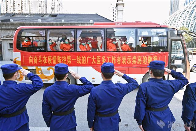 2020年3月19日下午1时50分,江西援助武汉医疗护理队在结束一个多月的支援任务后,分乘4辆大巴离开驻地武汉玉丰国际酒店,在警车带领下前往天河机场返赣。图为发车时,武汉消防救援支队武昌区“119党员突击队”队员向白衣天使敬礼。(湖北日报全媒记者 李溪 摄)