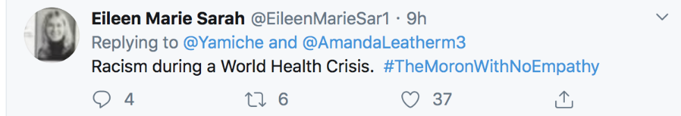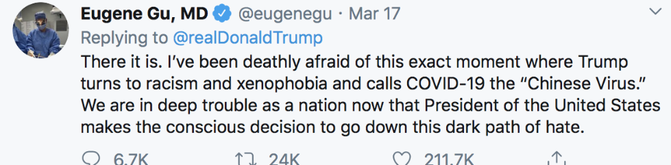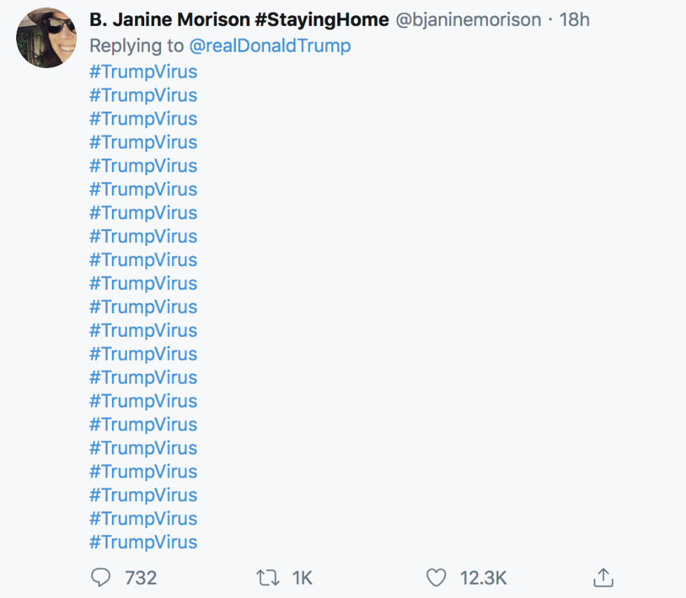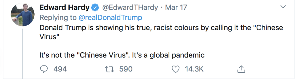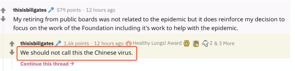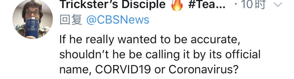 有网民反驳道,“特朗普的种族主义色彩显露无疑。这不是‘中国病毒’,这是全球流行病。”↓