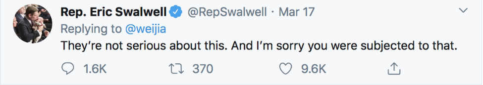 来自加州的联邦众议员埃里克⋅史沃威尔回复道,“他们不是认真的。我很抱歉你受到这样的待遇。这是惯常的种族主义。”