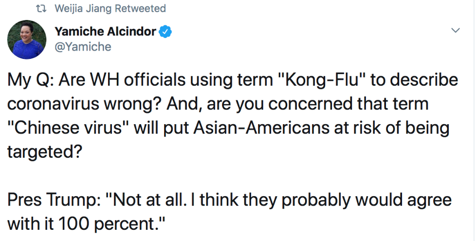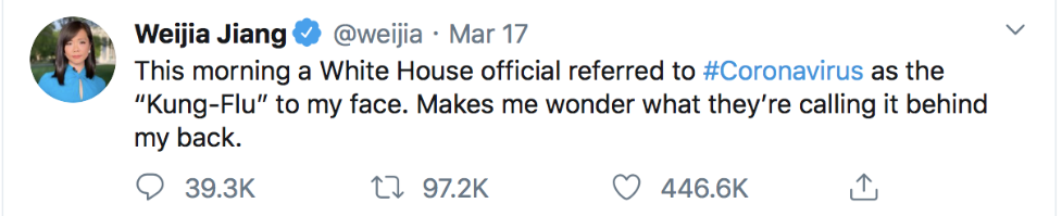 在特朗普之后,一名白宫官员又当着华裔记者的面称新冠肺炎为“功夫流感”(Kung-Flu)。