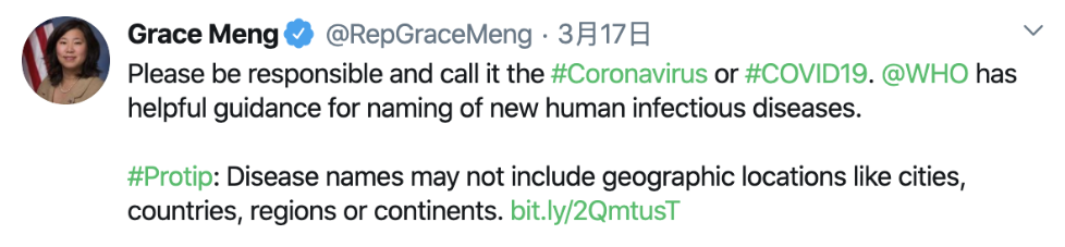 纽约州民主党议员孟昭文希望政界人士负起责任,不给新冠病毒贴标签。她说:“世卫组织对传染病的命名有指导规则,不能包括城市、国家、地区或大洲等地理位置。”