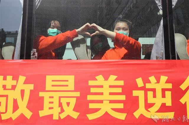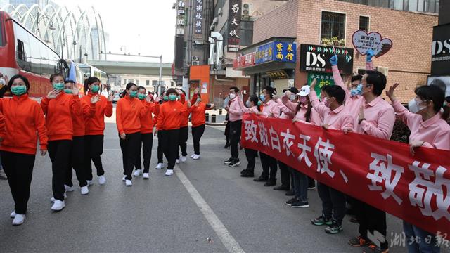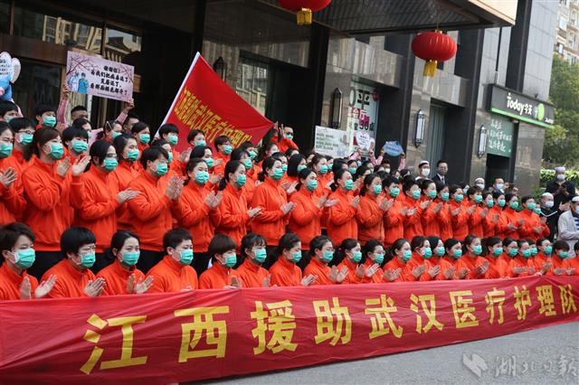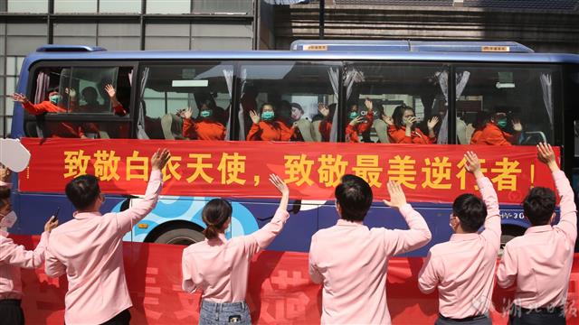 3月19日,江西援鄂医疗队101名队员离开下榻的酒店,乘坐大巴去武汉天河机场返程。