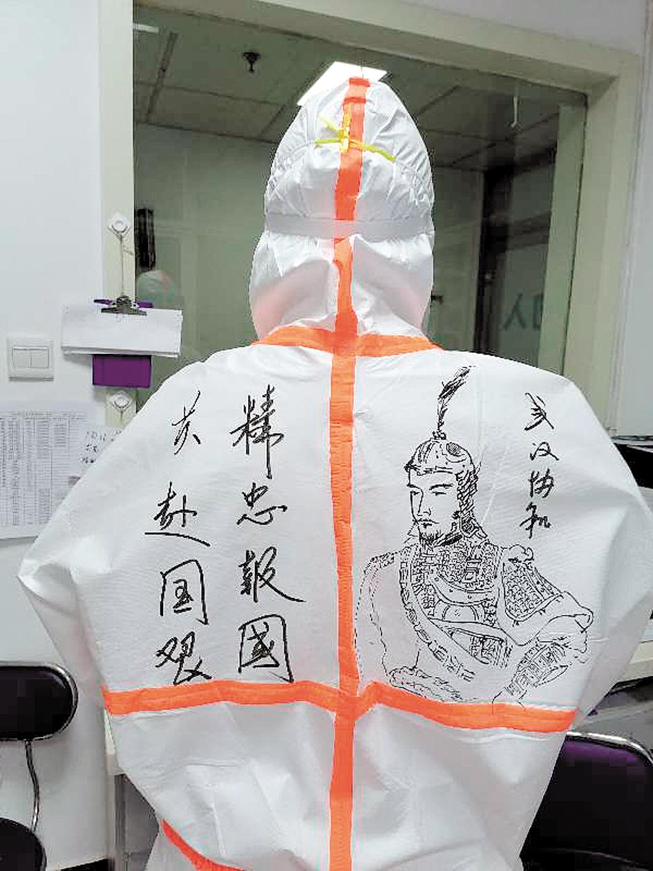 曹青在防护服上写上“精忠报国”。(通讯员 邱琼 供图)