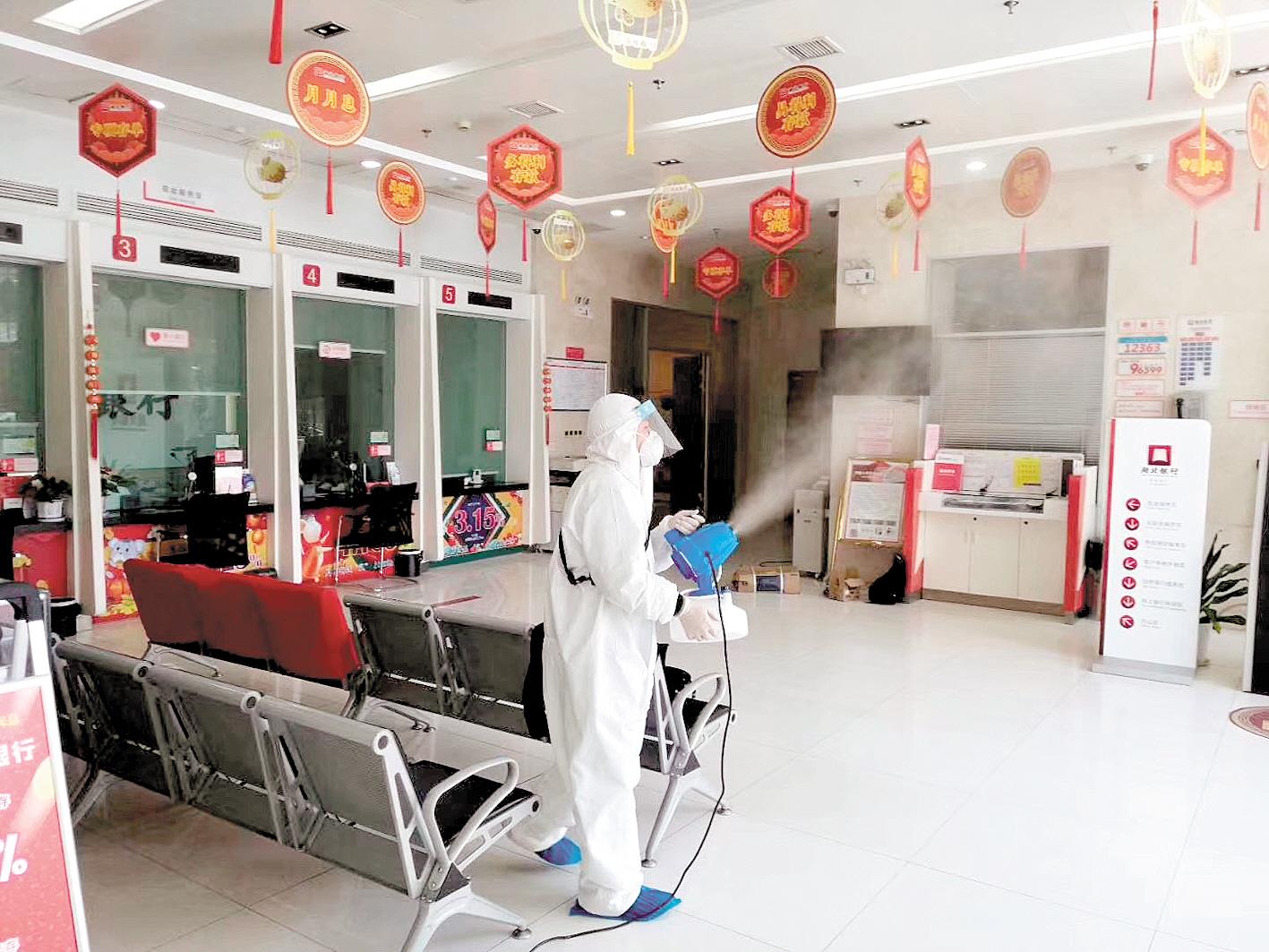 随着疫情防控形势好转,经当地疫情防控指挥部及监管机构批准,湖北省内部分银行网点于3月11日起开始有序安全复工,满足社会公众现金存取等金融业务需求。截至目前,全省银行网点已有三成以上恢复营业。图为湖北银行一网点对营业区域全面消杀。